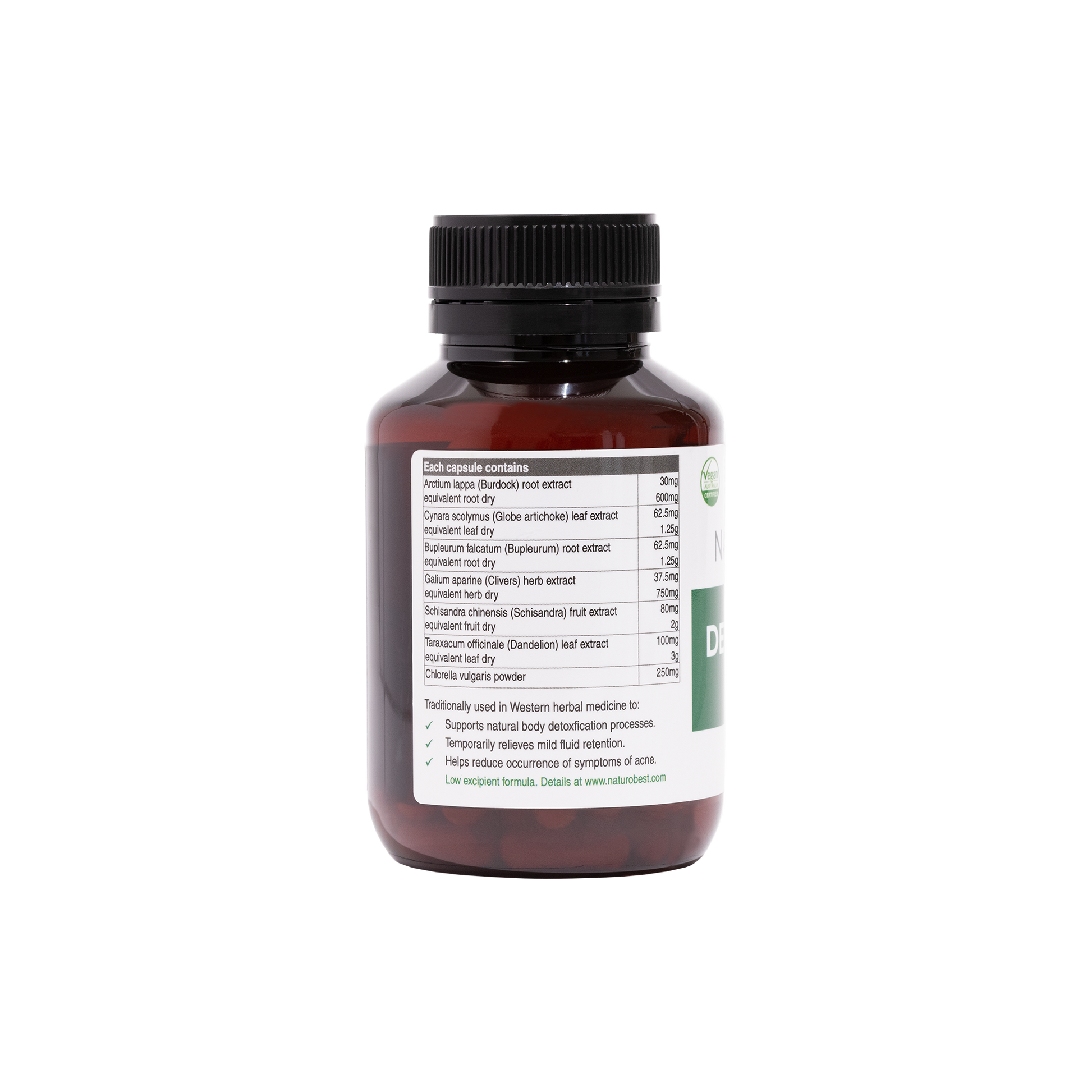 NaturoBest’s Detox & Liver Support is vegan-friendly, free from animal products, dairy, egg, fish/shellfish, gluten, lactose, msg, nuts, soy, oats and other grain derived ingredients, peanuts, sulphites, sucralose, wheat, yeast, magnesium stearate, stearic acid, microcrystalline cellulose, ascorbyl palmitate, titanium dioxide and other artificial colours, flavours and preservatives. Our Detox & Liver Support is also GMO free and free from many other allergens, please contact us to find out more.