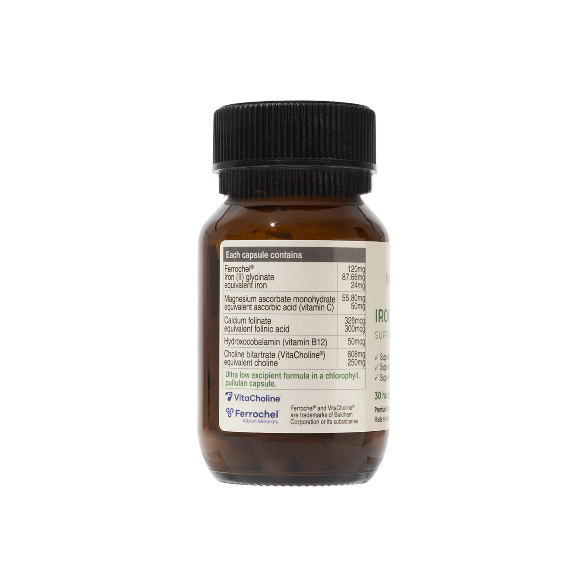The problem with a lot of iron supplements is they can cause gastrointestinal issues such as constipation. Iron bisglycinate is a form of iron that is more likely to be well-absorbed and well tolerated and is included in this formula as the patented Ferrochel®. Vitamins B12 and folate work synergistically with iron and vitamin C assists iron absorption.